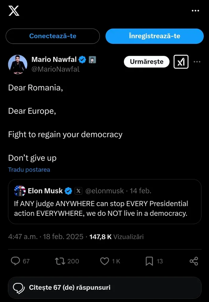 Întreg mesajul postat de Mario Nawfal a fost preluat și redistribuit de Elon Musk pe contul personal. Miliardarul și-a exprimat și punctul de vedere, unul categoric: „România merită suveranitate!”.