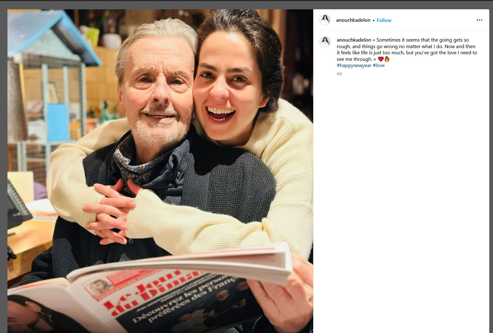 „Am o fată care este dragostea vieții mele, poate chiar puțin prea mult în comparație cu ceilalți, ceea ce poate fi supărător uneori”, a recunoscut Alain Delon în 2018 în emisiunea „Thé ou Café”. „Poate că am ajutat-o așa cum nu i-am ajutat suficient pe ceilalți.”